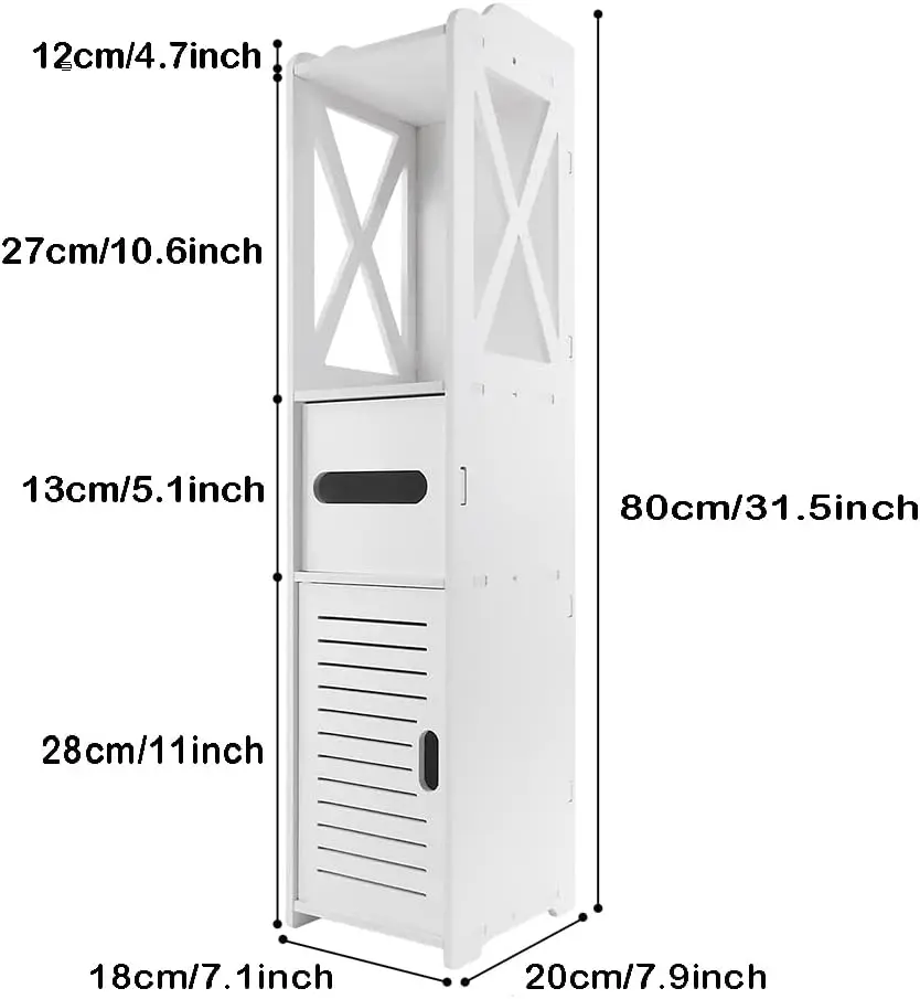 -3+1Tier openable storage cabinet,the maximum load-bearing capacity of a single layer is 5kg. This slim storage cabinet could be placed into corner or in the narrow space that between the tub and the toilet to utilize the space adequately,is the perfect choice for collecting sundries and beautifying corners.