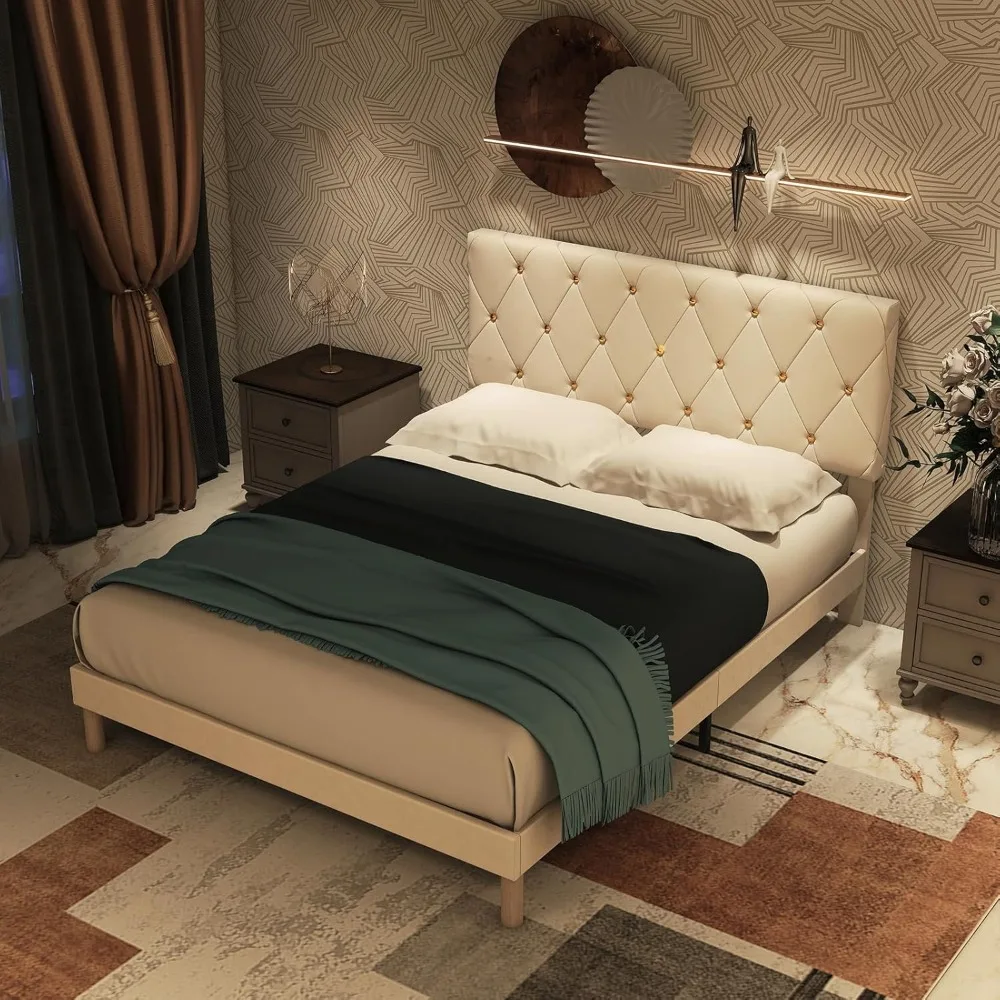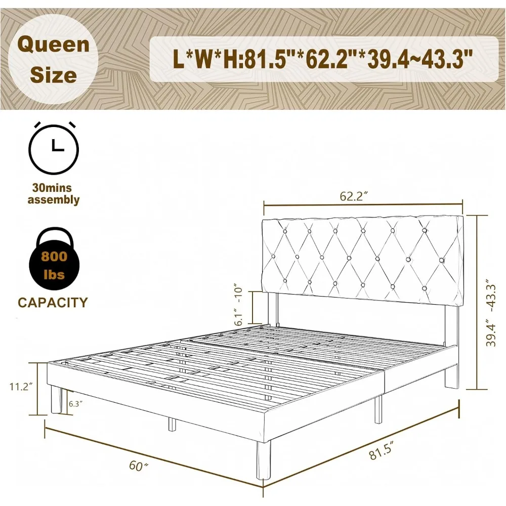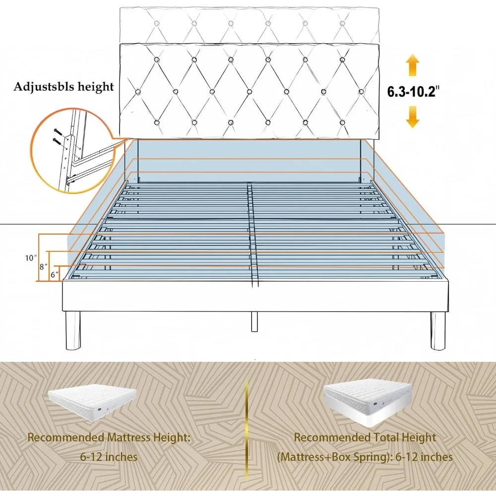 - No Box Spring Needed: Durable wooden slats will extend the life of your mattress. This queen size upholstered bed frame is suitable for a variety of mainstream mattresses. The queen platform bed frame with headboard recommended mattress thickness is 8-12 inches